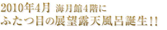 海辺ならではの潮騒と風情を贅沢に堪能できる露天風呂が新たにオープンしました。 朝夕交代制の大浴場のいずれにも展望露天風呂ができる事になりますので、 時間による淡路の移り変わりと天然温泉をお楽しみください。
