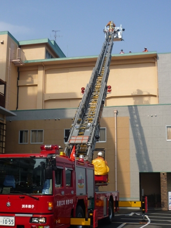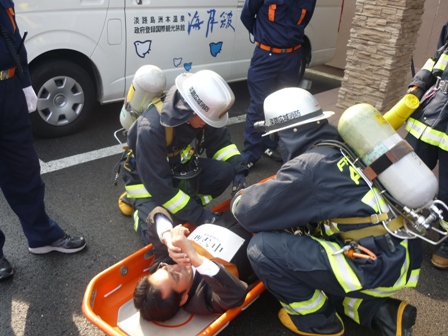 訓練は、昼間に宴会中の部屋から出火して多数が取り残されたという想定で行われました