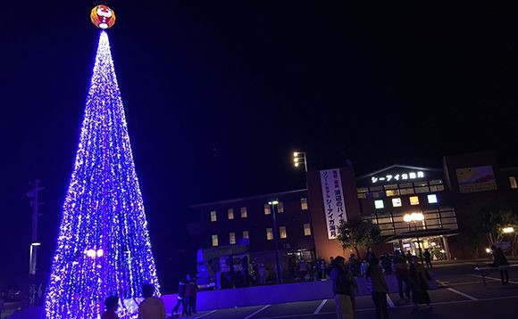 イブの日は14時も過ぎてくると、結構日が陰ってきますよね。曇ってたりしたらなおさら。淡路島には結構大きなツリーがいろいろ建ってますので、クリスマス気分を盛り上げるために島内にあるツリーを探しに出かけるのもいいんじゃないかと思います。ちなみに海月館とサンライズ淡路、シーアイガ海月の3ヶ所にも結構おおきな(しかもちょっと変わった)ツリーが立っていますので、スタンプラリー的に回ってみるのもオススメかもしれませんね。写真はシーアイガ海月の先日完成した島内最大級の高さ15mクリスマスツリー(ツリートップに注目)。