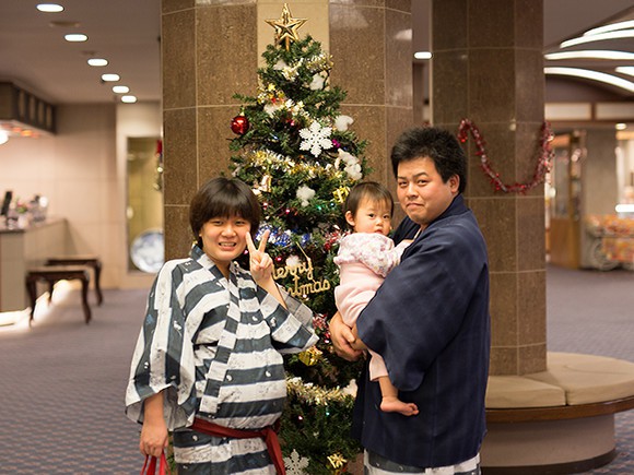 最後に今日ロビーの写真を撮っていましたら、かわいいお客様を発見してしまったので、記念にツリーの前でお写真撮らせて頂きました。赤ちゃんプランでのお泊りのH様でした。ママのお腹には新しいご家族が。素敵ですね。