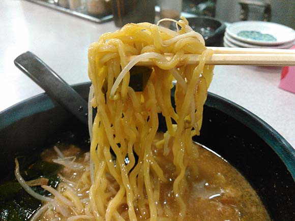 コッテリと濃い味付けの、昔ながらの味噌ラーメンの味付けですね。前述の2つのお店より、より塩気の強い濃厚なスープです。