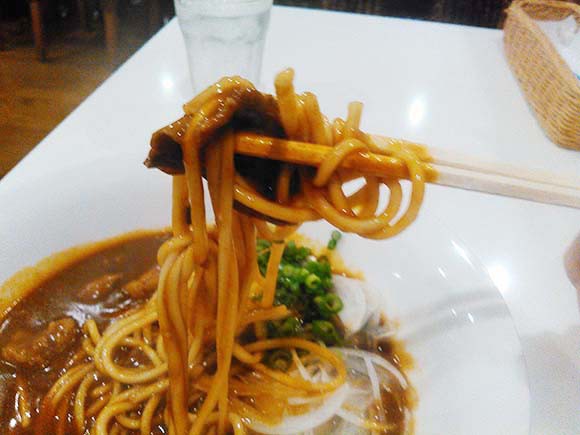 ルーにとろみがあるので麺にしっかり絡んで口に運べます。