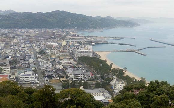 三熊山山頂からの洲本市街と大阪湾一望する絶景も併せてお楽しみいただけます。写真中央が上から見た海月館です。