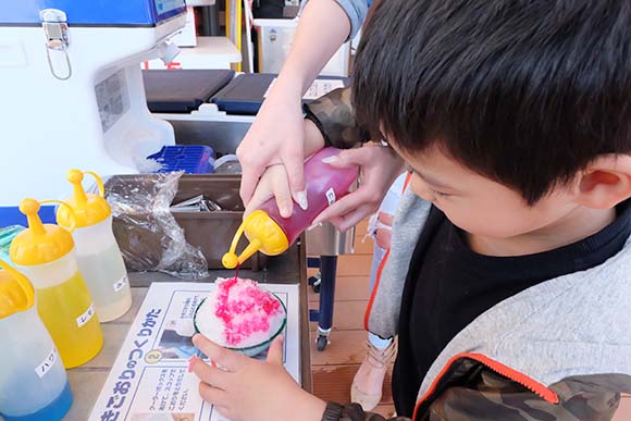 氷をけずった後は、好きな味のシロップを思い通りにかけて…