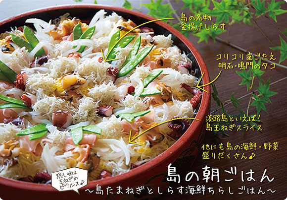 朝ごはんと侮るなかれ、食べやすいながらも食べ応えバツグンの美味しさとボリューム。しらす・鯛・玉ねぎ・その他淡路島の幸など、淡路島の恵みがたっぷり詰まったこれだけで淡路島を味わい尽くせる嬉しいセットです。