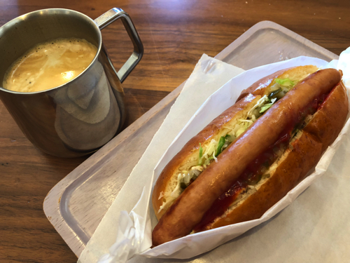 今日は手作りホットドックとホットコーヒー。この他に持ち帰り用で練乳パンを購入。