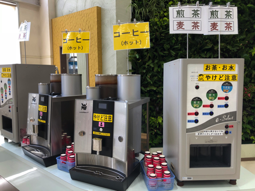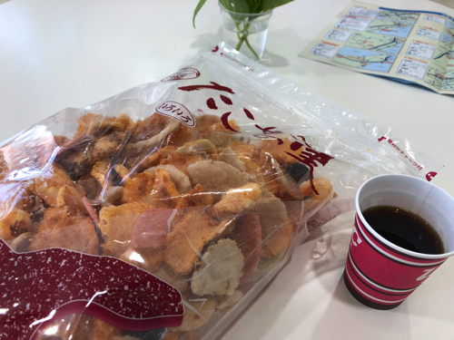 無料のコーヒーで小休止。写真は購入した”いろいろ”のタコせんべい。試食を休憩コーナーに持ち込まないように。