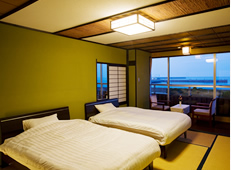 We have three types of rooms. One is a Japanese-style room. You will sleep on a Futon which is placed on a Tatami floor in the room, giving you the feel of real Japanese life style. Second is a Western-style room. There are two semi-double beds that provides a calm and relaxing atmosphere. Third is a Japanese/Western style room in which we provide a couth large room and an intimate Western room where you can take a long look at the beautiful ocean. If you would like to get more information about these rooms, please click pictures below.